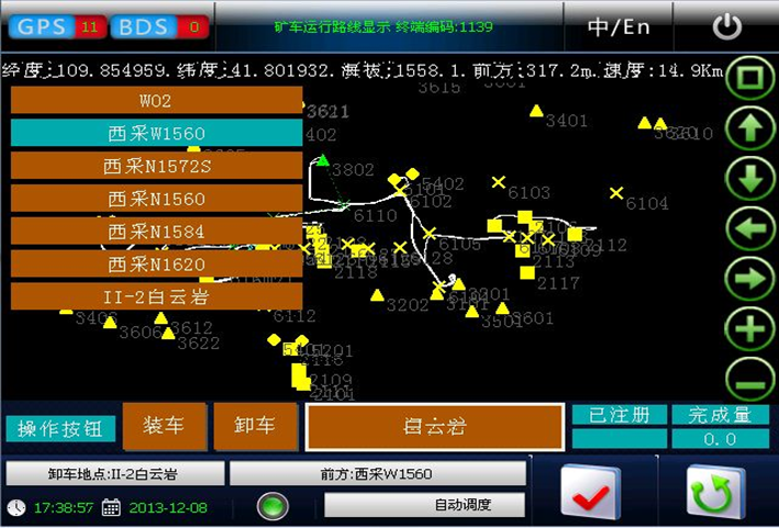 車載終端是安裝在挖機、鉸卡、鉆機及其它輔助車輛等設(shè)備上的專用計算機。由中央微處理機、觸摸屏、顯示屏、衛(wèi)星定位系統(tǒng)、接口系統(tǒng)和電源系統(tǒng)組成。各部分與主體之間采用高強度電纜、航空插件聯(lián)接。車鏟通用的智能終端適應(yīng)工業(yè)現(xiàn)場能力強,對過壓、過流、過熱、欠壓具有自保護(hù)功能,還具有防水、防塵、防過熱、抗震等功能。智能終端能夠收發(fā)指令信息,并實時的將現(xiàn)場的生產(chǎn)情況和設(shè)備狀況傳遞到總控系統(tǒng)。智能終端系統(tǒng)采用觸摸屏控制,界面清晰明了,操作簡單。
